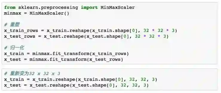 首先将训练数据集重塑为 [50000, 3072] 的形状,利用 minmax 来进行归一化。最后再将图像重塑回原来的形状。