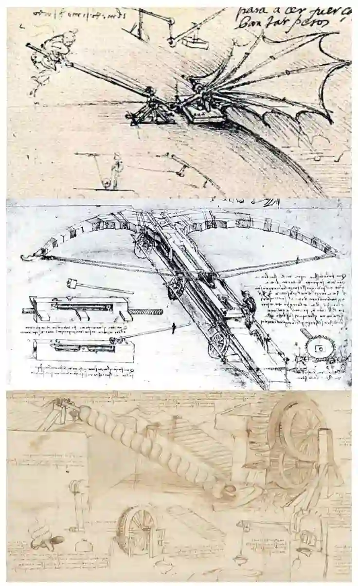图 | 从上到下,分别是达·芬奇设计的飞行器、巨型弓弩和永动机(来源:网络)