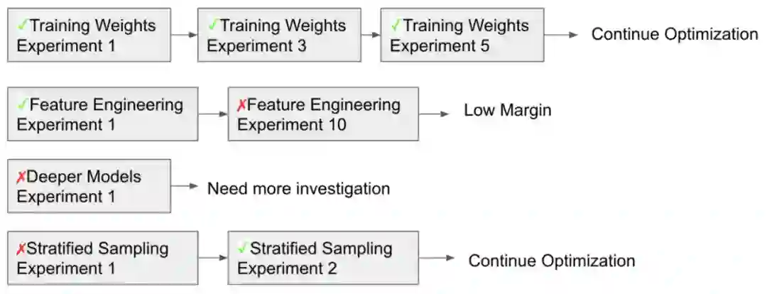 在机器学习的世界中有太多的想法和直觉了。我们都可以轻松地提出几十种值得尝试的方向:更多的特征、更深度的模型、不同的召回模型、不同的分层抽样、多目标优化、探索与利用等等。我们在做这些选择的时候需要考虑投资回报比,我们很容易估算成本,但是计算回报却很困难。