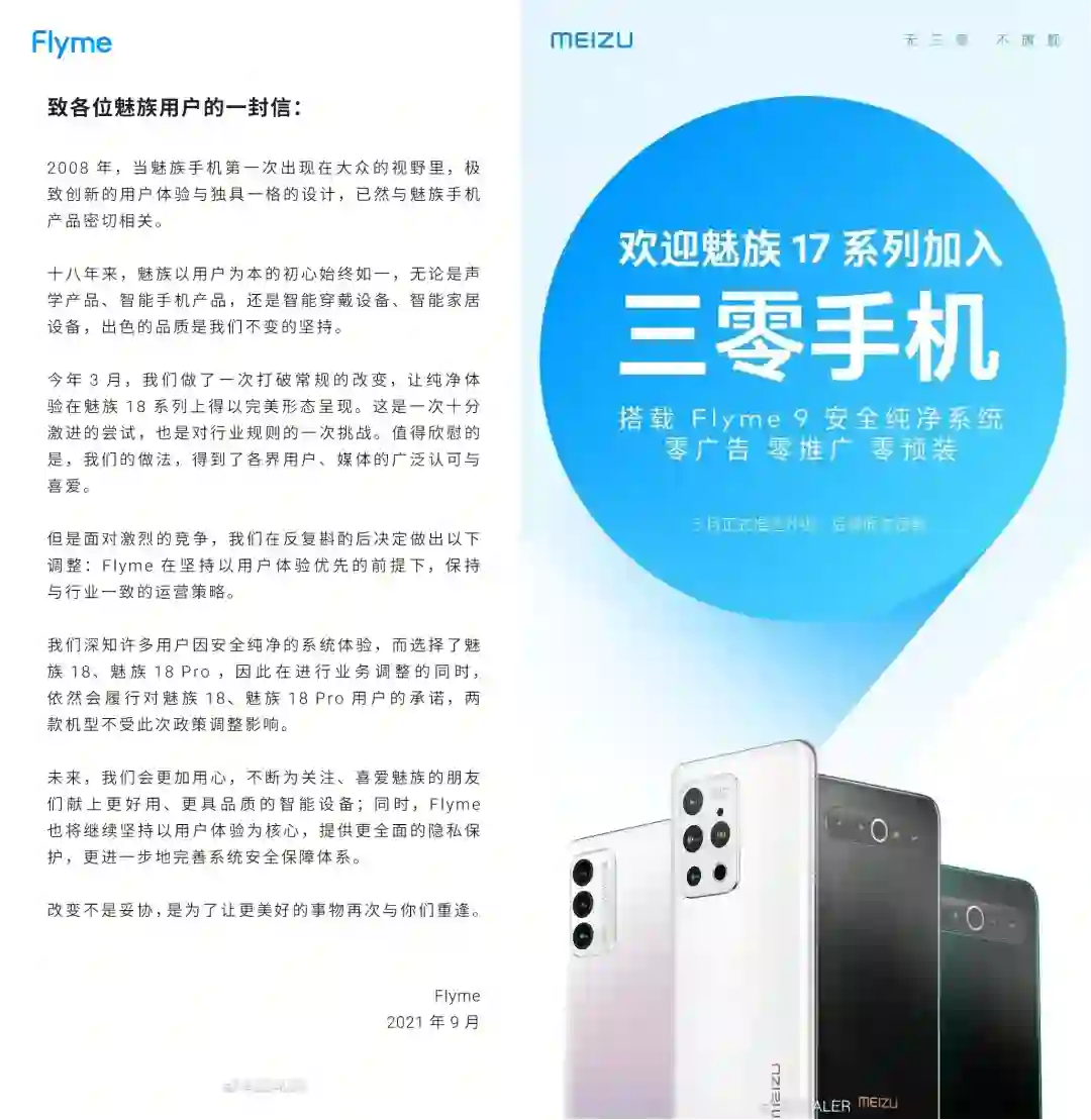 最引人关注的,要数 Flyme 9 引入的“三零”手机概念:0 广告、0 推送、0 预装。手机广告无孔不入的今天,“三零”的概念无疑是业界清流。然而半年之后,魅族终究是 “悔棋”了 ,在魅族 18、18 Pro 之外的手机上取消了三零策略,恢复系统广告。比起来时的惊叹,这一走徒留一片叹息。