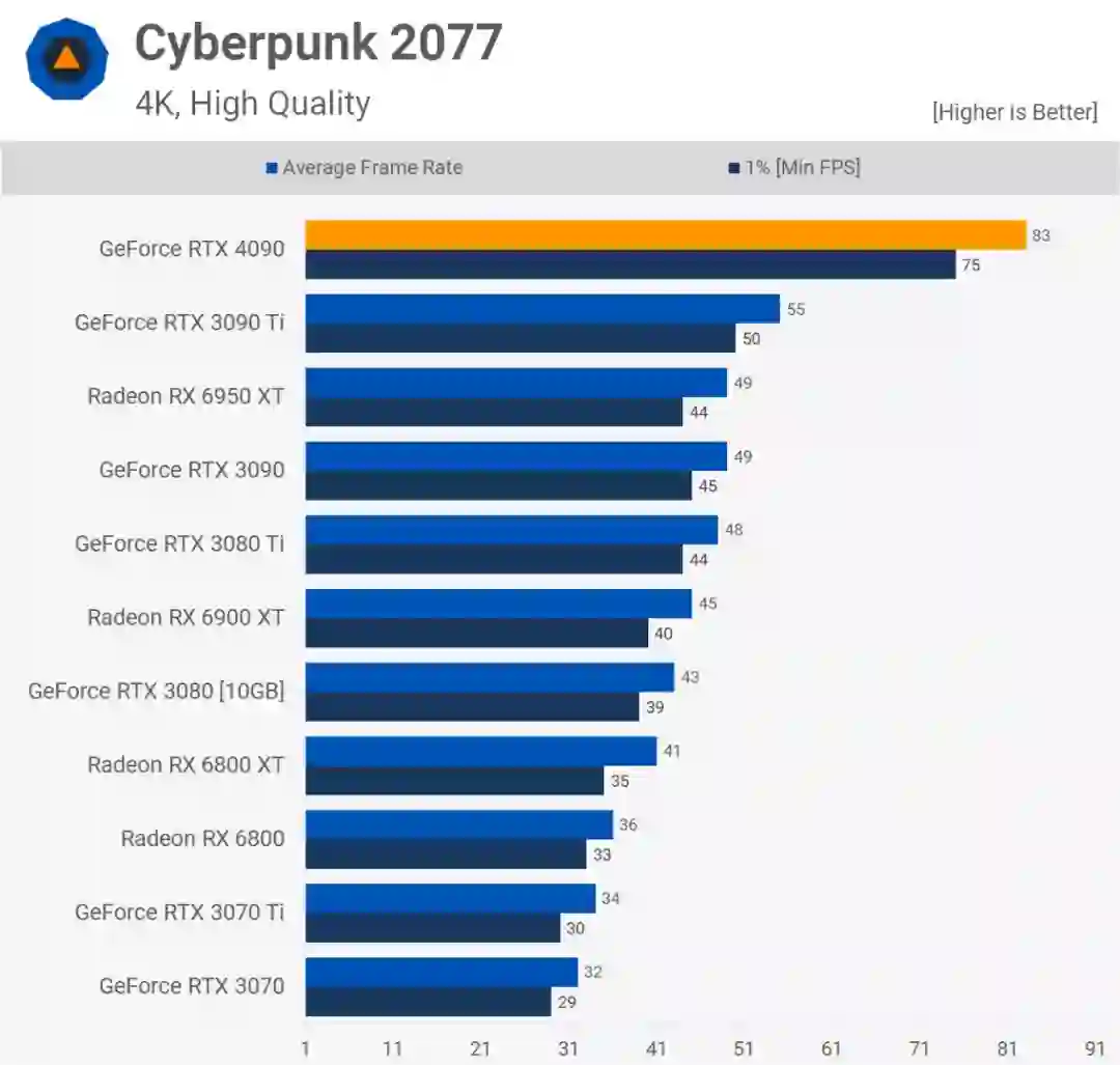 另一款游戏「赛博朋克 2077」,对 CPU 和 GPU 的要求都很高。而安装了 RTX 4090 后,我们几乎可以肯定 CPU 会受到 1440p 的限制。测评结果表明,RTX 4090 在赛博朋克上的平均刷新率为 145 fps,比 6950 XT 高 33%,比 3090 Ti 高 36%。