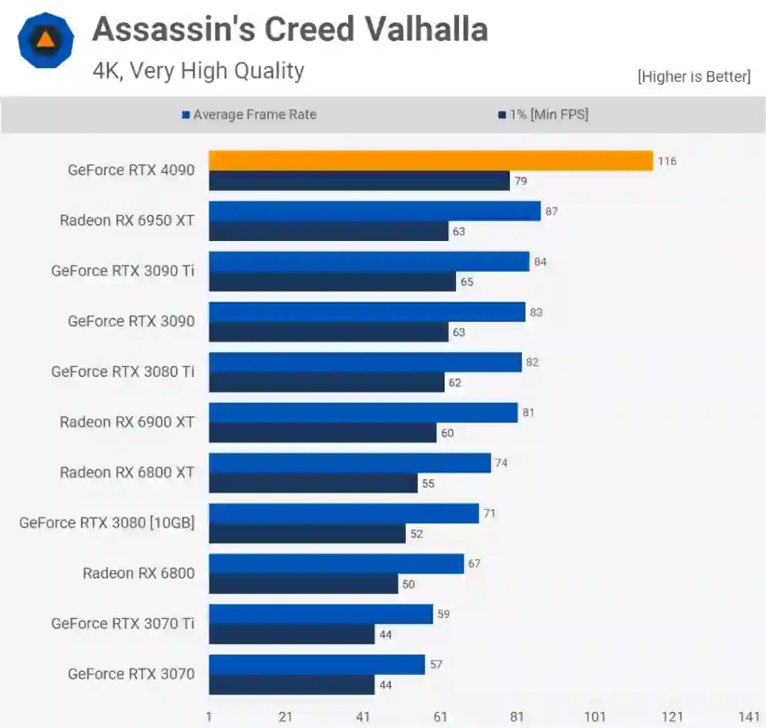 「刺客信条:英灵殿」也是一个在 A 卡上运行良好的游戏。测评结果表明,在 1440p 情况下,RTX 4090 的帧率比 6950 XT 高了 27%,这是一个不错的增益,但远不如其他对比提升,并且 RTX 4090 也仅比 3090 Ti 提高了 37%,而不是 4K 时的 60% 增益。