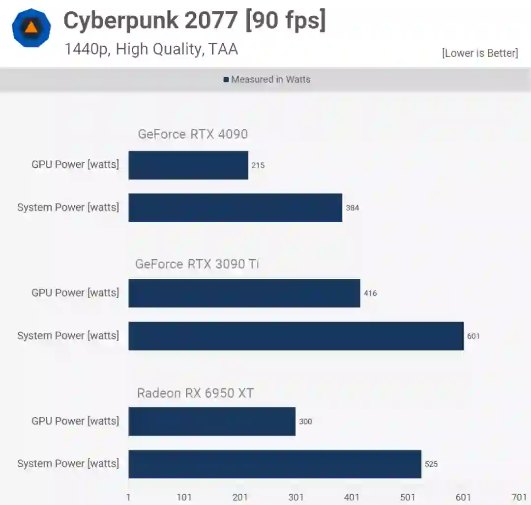 下面来看看 RTX 4090 的能效如何,通过将帧速率锁定在 90 fps,我们可以看到每个 GPU 使用了多少功率。