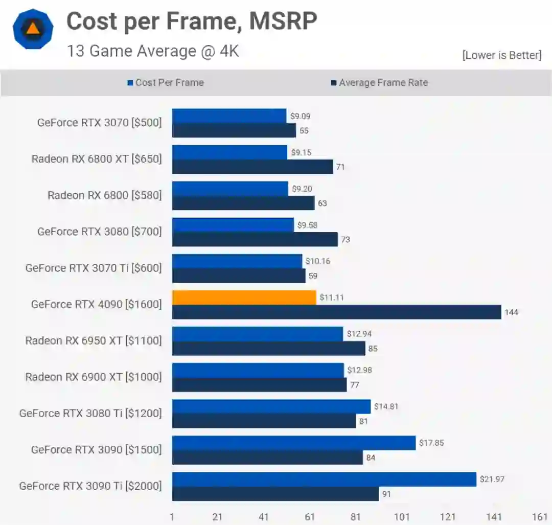 如果对比的是实际售价,RTX 4090 的吸引力就降低了。在 1440p 分辨率下性价比要比 3090 Ti 略差,使其成为市场上每帧成本和整体价格最昂贵的 GPU。