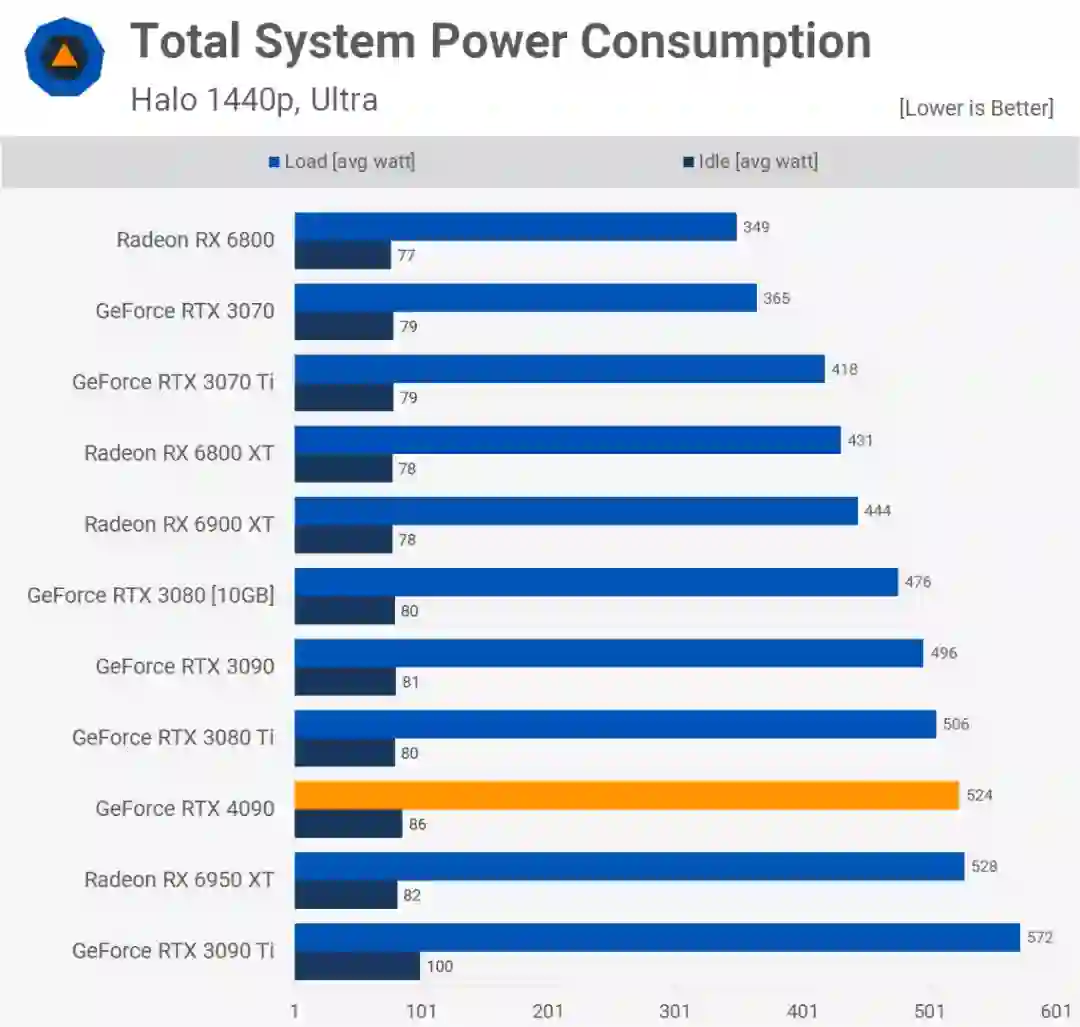 摩尔定律终结之后,提升芯片性能的方式经常是增加功耗,这一点在旗舰 GPU 上尤为明显。测试者尝试以 1440p 玩「光环:无限」观察总系统功耗,可看到 RTX 4090 实际上并没有想象的那么糟糕。事实上它的性能比 RX 3090 Ti 高 50%,同时功耗更低。RTX 4090 和 3090 Ti 都是 450W 显卡,所以从技术上讲,它们的功耗应该差不多。