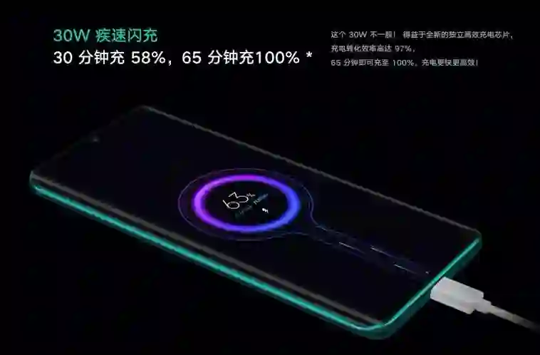这次Redmi K30 的快充是配备的30W,充电到58%大概需要30分钟,到达100%需要65分钟左右,总电容量达到4500mAh。那么 4G 版本的 K30 配备的是27W的充电头,30W 只配备在5G的版本。