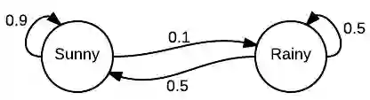 试想有两种可能的天气状态:晴天或者阴天。你总是可以直接地观察当前的天气状态,而且保证是之前提及的两者之一。现在,你决定预测明天的天气。假设在这个过程中有一个潜在的转移,因为当前的天气会对第二天的天气状态有所影响。因此,作为一个敬业的人,你收集了几年的天气数据,然后计算得到阴天之后出现晴天的概率是 0.25。你还注意到,广泛地讲,阴天之后发生阴天的概率是 0.75,因为只有两种可能的天气状态。你现在可以利用这个分布,根据当地目前的天气状态去预测未来几天的天气。