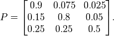 形式上,马尔可夫链是一个概率自动机。状态转移的概率分布通常表示为马尔可夫链的转移矩阵。如果马尔可夫链有 N 个可能的状态,那么这个转移矩阵就是 N*x*N 的矩阵,使得元素 (I, J) 代表从状态 I 转移到状态 J 的概率。此外,状态转移矩阵必须是随机矩阵,它的每一行元素之和必须是 1。这完全是能够讲得通的,因为每一行代表它自己的概率分布。