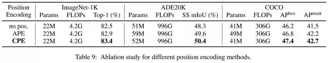 位置编码可以引入空间位置感知来实现自注意力的特征聚合,在Transformer中起着重要作用。本文比较了几种常用的位置编码方法,如无位置编码(no pos.)、绝对位置编码(APE)和条件位置编码(CPE)。如表9所示,CPE的性能最好。不使用任何位置编码将导致严重的性能下降,这证明了位置编码在Vision Transformer模型中的有效性。