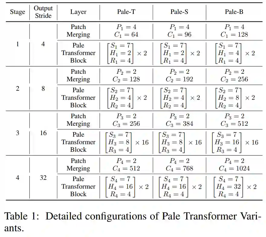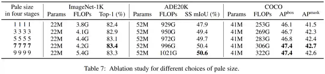 4个阶段的Pale-size控制了上下文信息丰富度与计算成本之间的权衡。如表7所示,增加Pale-size(从1到7)可以持续提高所有任务的性能,而进一步增加到9不会带来明显的、持续的改进,但会带来更多的FLOPs。因此,默认情况下,对所有任务使用 。