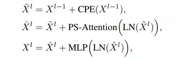其中,LN(·)为层归一化。CPE被实现为一个简单的深度卷积,它在以前的工作中广泛使用,因为它兼容任意大小的输入。Eq.(7)中定义的PS-Attention模块是通过将Eq.(1)对Eq.(3)依次执行来构造的。Eq.(8)中定义的MLP模块由2个线性投影层组成,依次展开和收缩嵌入维数。