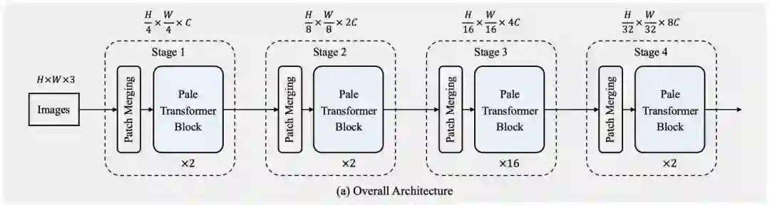 如图2(a)所示,Pale Transformer通过遵循CNN和Transformer的设计,由四个层次级阶段组成,用于捕获多尺度特征。每个阶段包含一个Patch合并层和多个Pale Transformer Block。patch merge层的目标是对输入特征进行一定比例的空间下采样,并将通道维数扩展2倍以获得更好的表示能力。