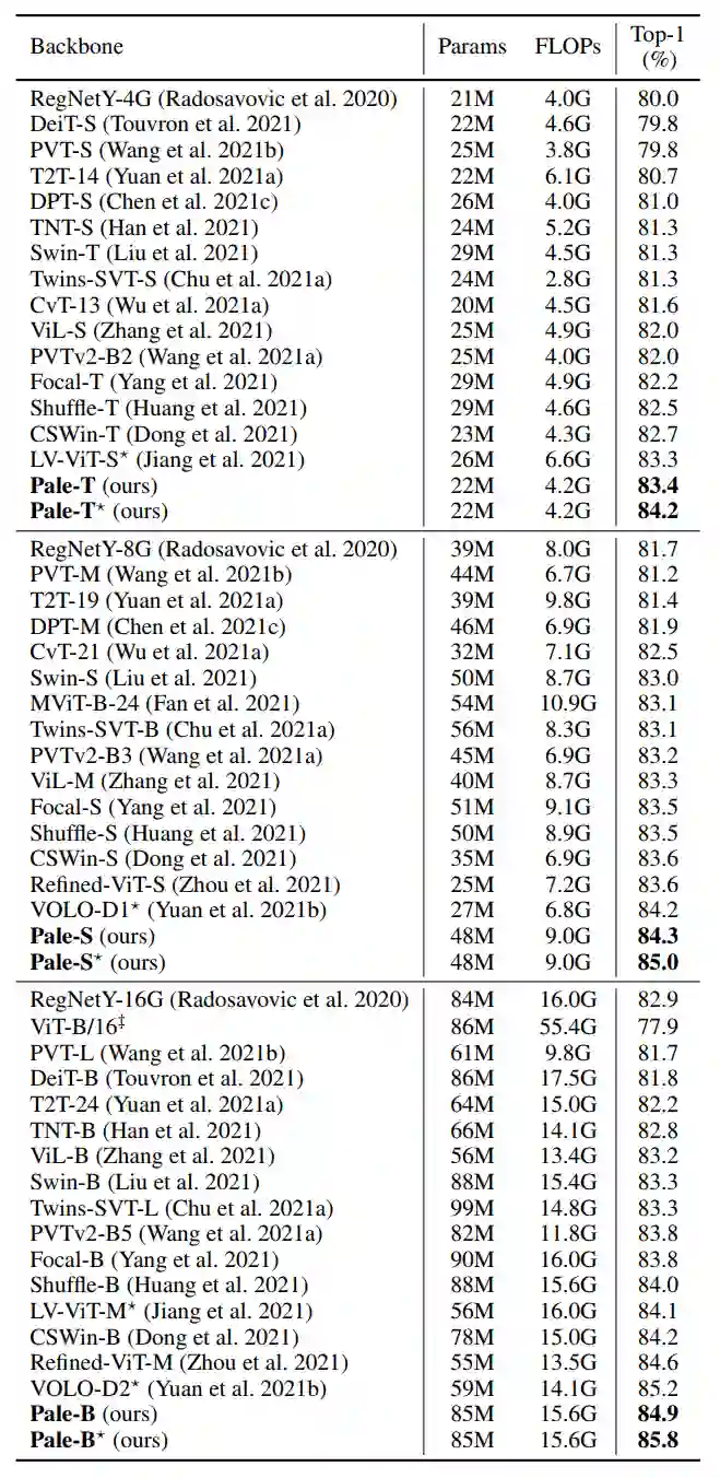 本文基于提出的PS-Attention设计了一个具有层次结构的通用Vision T燃烧former Backbone,命名为Pale Transformer。作者将本文的方法扩展到一系列模型,包括Pale-T(22M)、Pale-S(48M)和Pale-B(85M),达到了比以前方法更好的性能。
