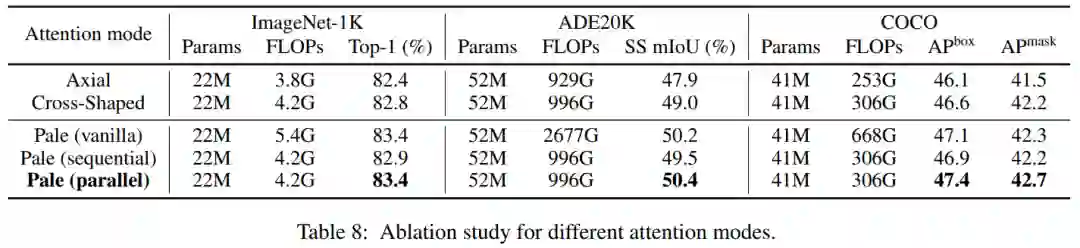 顺序算法在连续块中交替计算行方向和列方向上的自注意力,而并行算法在每个块内并行执行行方向和列方向的注意力。如表8所示,并行PS-Attention在所有任务上都取得了最好的结果。作者将此归因于在普通的PS-Attention中,对于非方形输入大小的过多填充将导致轻微的性能下降。
