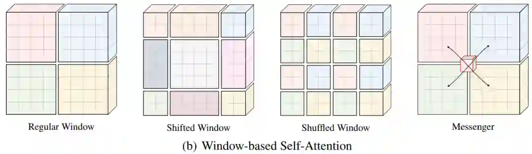 一种典型的方式是在规则的方形窗口之间构建连接。例如,在连续块中交替使用常规窗口和另一种新设计的窗口分区方式(图1(b)中Shift Window或Shuffle Window),并操作Messenger Tokens来跨窗口交换信息。