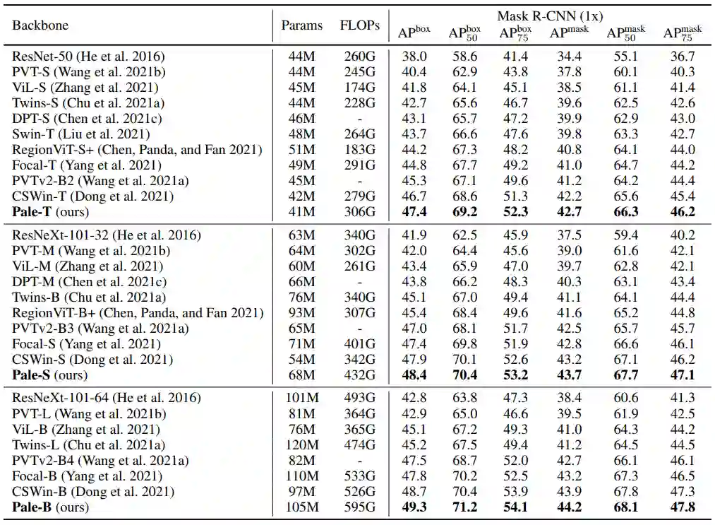此外,Pale Transformer变体在实例分割上也有一致的改进,分别比之前的最佳Backbone提高了+0.5、+0.5、+0.3 mask mAP。