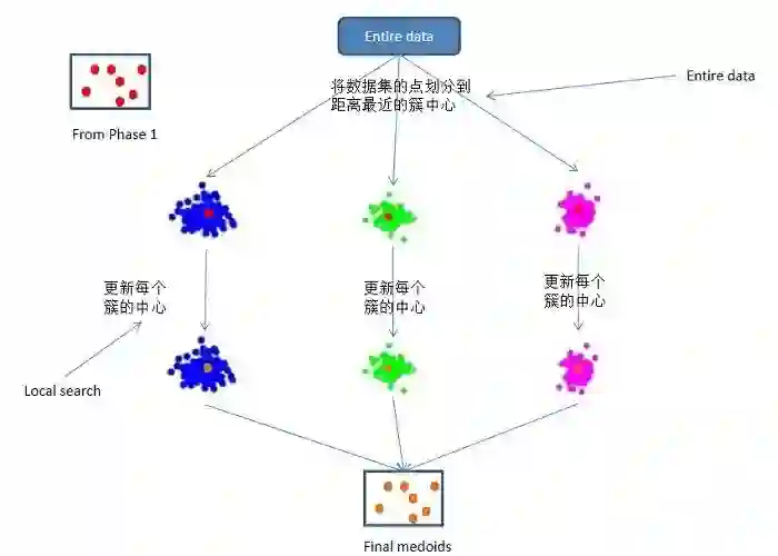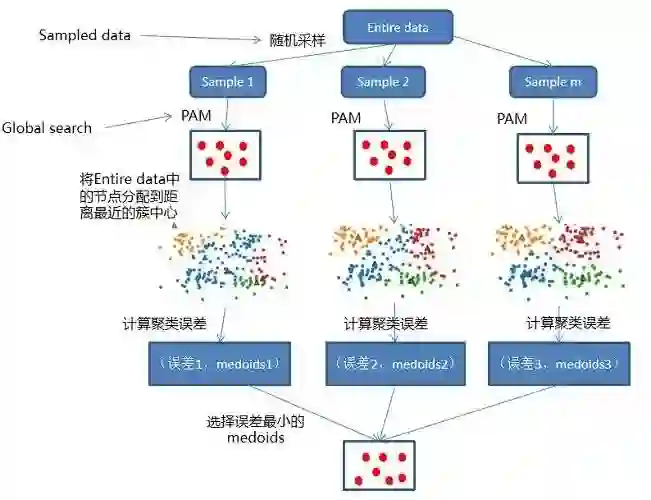 算法思想:对整个数据集进行随机采样(sampled data ),生成m个规模为n的子集。然后对m个子集并行执行PAM算法(global search),计算整个数据集的聚类误差,选择聚类误差最小的中心集合