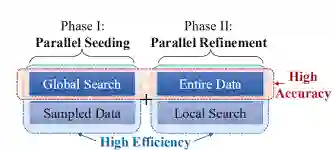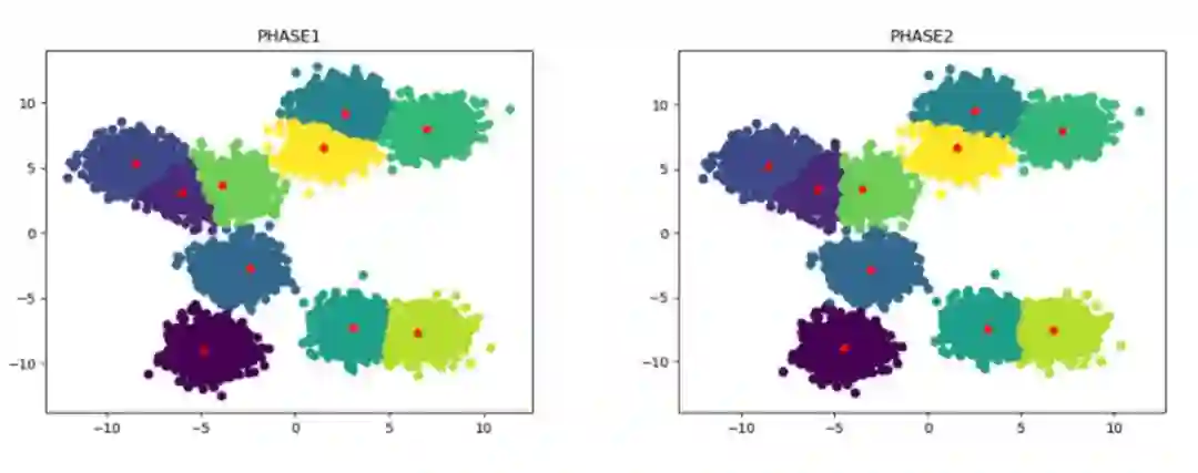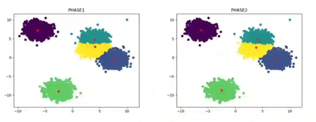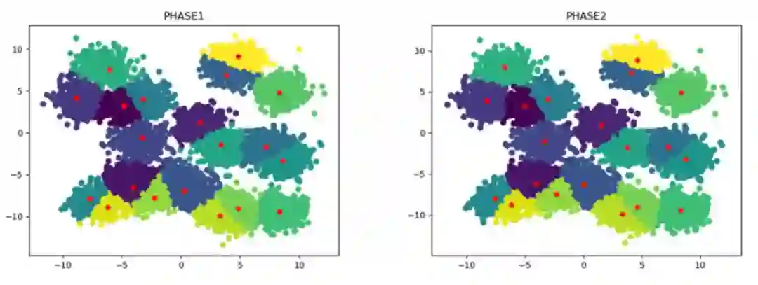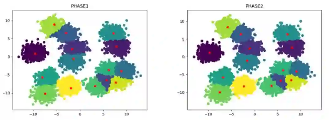 经过Phase 1的步骤,已经得到了一个近似的聚类中心集合,但是Phase 1中的中心集合是从sampled data中得到的,因此可能与真实的中心还存在一定的偏差,第二阶段就是为了对第一阶段生成的中心集合进行微调