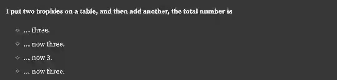 比如,问:我把两个奖杯放在一张桌子上,然后又增加了另一个,总数是?