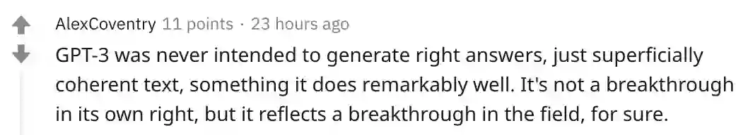 此外,有网友认为,GPT-3从来就没打算生成正确的答案。在生成连贯的文字方面,它已经做得非常好了。GPT-3的这种进步,显然反映了NLP领域的一种突破。