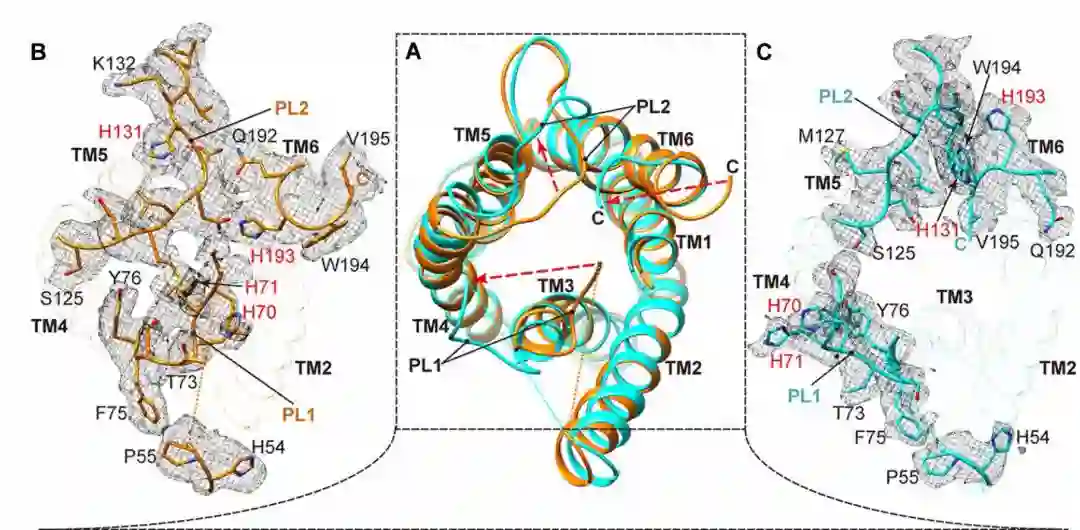 Z. Hong Zhou教授和他的同事也设计了突变尿素通道的方法,他们将不同的氨基酸作为突变的关键点并测试了在不同酸度水平下哪些突变氨基酸可以干扰尿素通道的开关状态。这些实验使科学家能够明确尿素通道中究竟哪些蛋白核心区参与感知酸度并改变整个通道的开放状态。