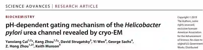 George Sachs,Z. Hong Zhou, Keith Munson. pH-dependent gating mechanism of the Helicobacter pylori urea channel revealed by cryo-EM