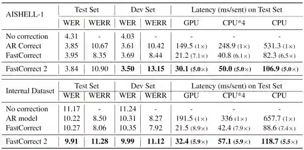 图七:在 AISHELL-1 和微软内部的数据集上,FastCorrect 2 和基线方法在词错误率和解码延迟上的对比。