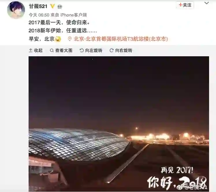 这条微博的定位是北京首都国际机场T3航站楼,这表明其本人已经回国。此外,甘薇在回复网友评论时表示,会妥善处理好乐视网问题。