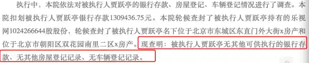 同时,该法院查明,贾跃亭无其他可供执行的银行存款、无其他房屋登记记录、无车辆登记记录。