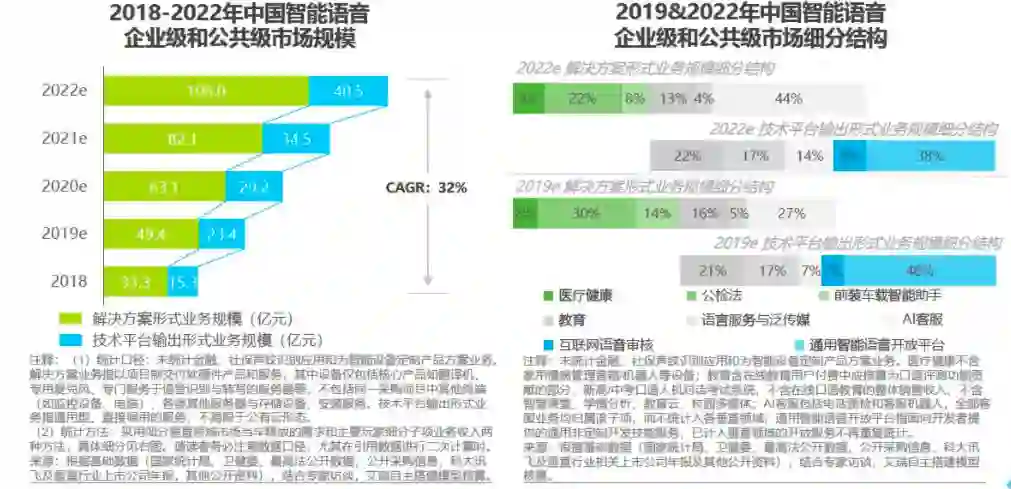 根据艾瑞咨询的数据,2018年中国智能语音市场解决方案形式业务规模达到了33亿,预计2022年将超过100亿。