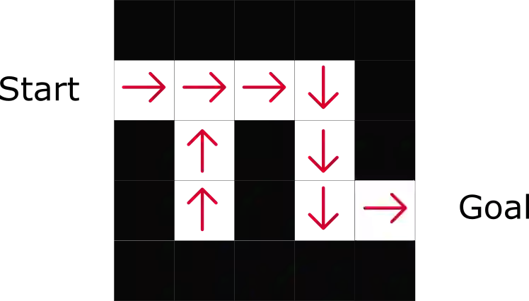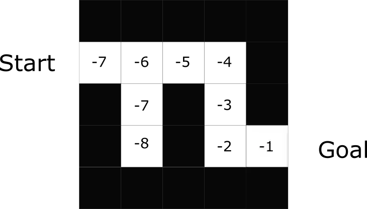 在迷宫示例中,在每个步骤中我们将采用最大值:-7,然后是-6,然后是-5(依此类推)以达到目标。