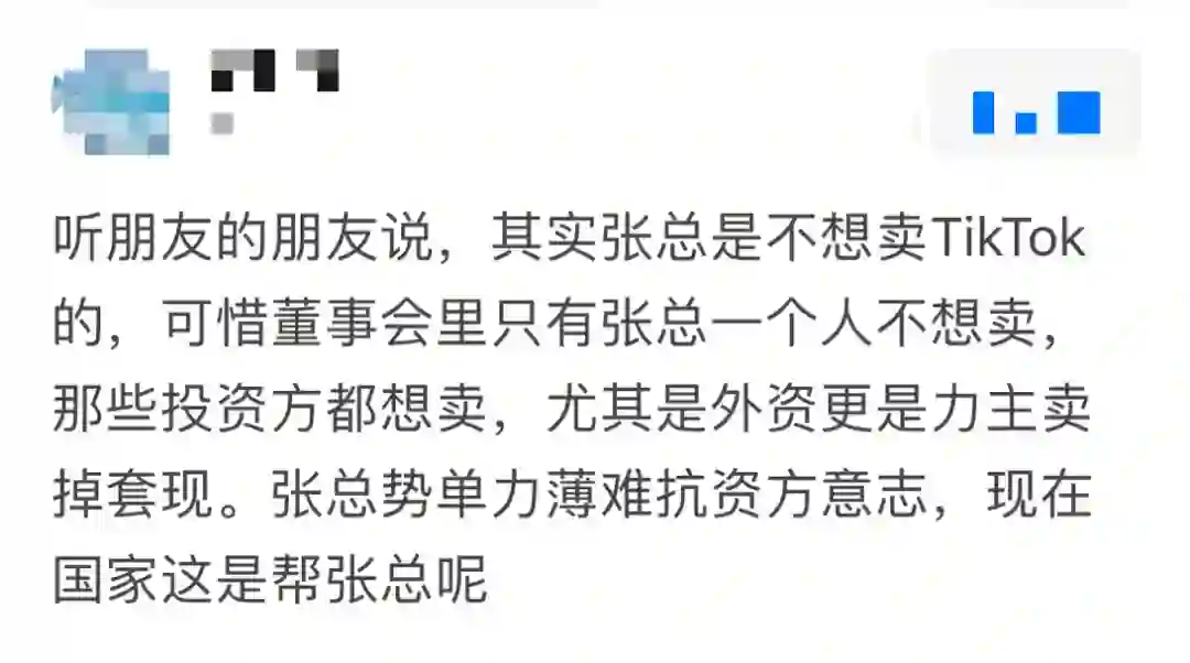 一名知情网友表示,「听说,张总不想卖TikTok的,可惜董事会里只有张总一个人不想卖,那些投资方都想卖,尤其是外资更是力主卖掉套现。张总势单力薄难抗资方意志,现在国家这是帮张总呢」