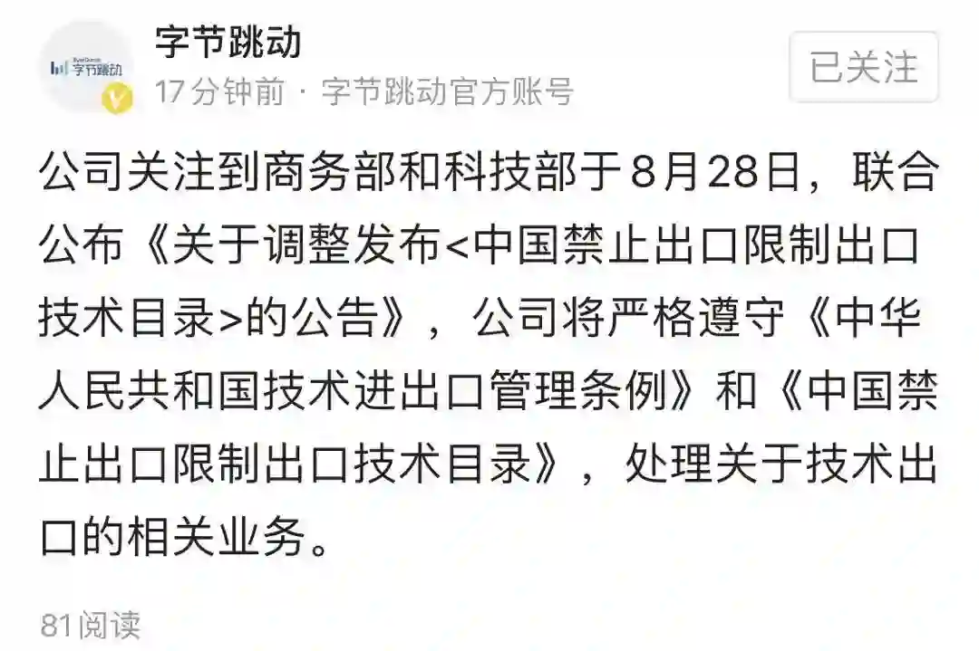 而近日我国调整《中国禁止出口限制出口技术目录》,是中国的法律。字节方回应「将严格遵守」。