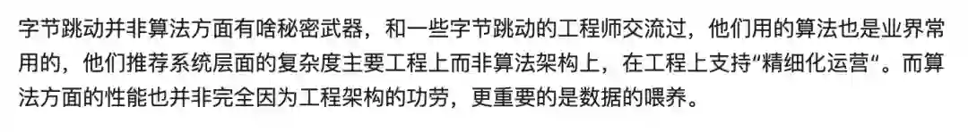 知乎上也有数据科学专家提到,「字节推荐系统层面的复杂度主要在工程上,而非算法结构上,在工程上支持『精细化运营』。