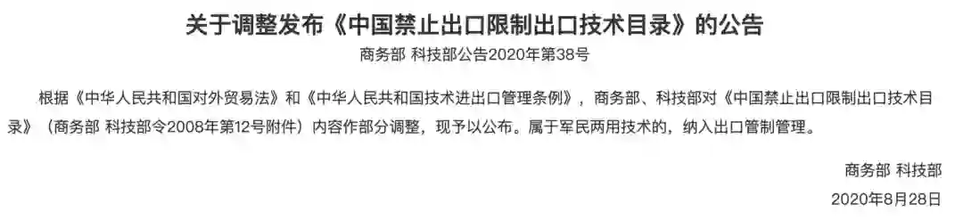 近日,商务部联合科技部调整发布了《中国禁止出口限制出口技术目录》公告。