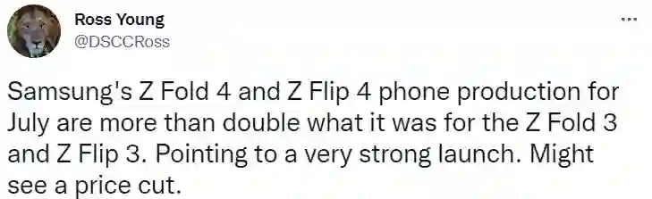 爆料者 Ross Young 在海外社交平台透露称,三星在 7 月份的 Galaxy Z Fold 4 和 Z Flip 4 手机产量是上一代同期产量的两倍,预计这一代的 Galaxy Z 系列折叠屏手机售价将降低。此外,还有消息显示,三星 Galaxy Z Flip 4 的电池将由 LG 供应;有行业人士认为,这一举措有望降低生产成本、提高利润率,手机的售价也有望降低。目前 Galaxy Z Fold 4 的一款电池已经通过了认证,但该电池的容量有可能会变得更小。