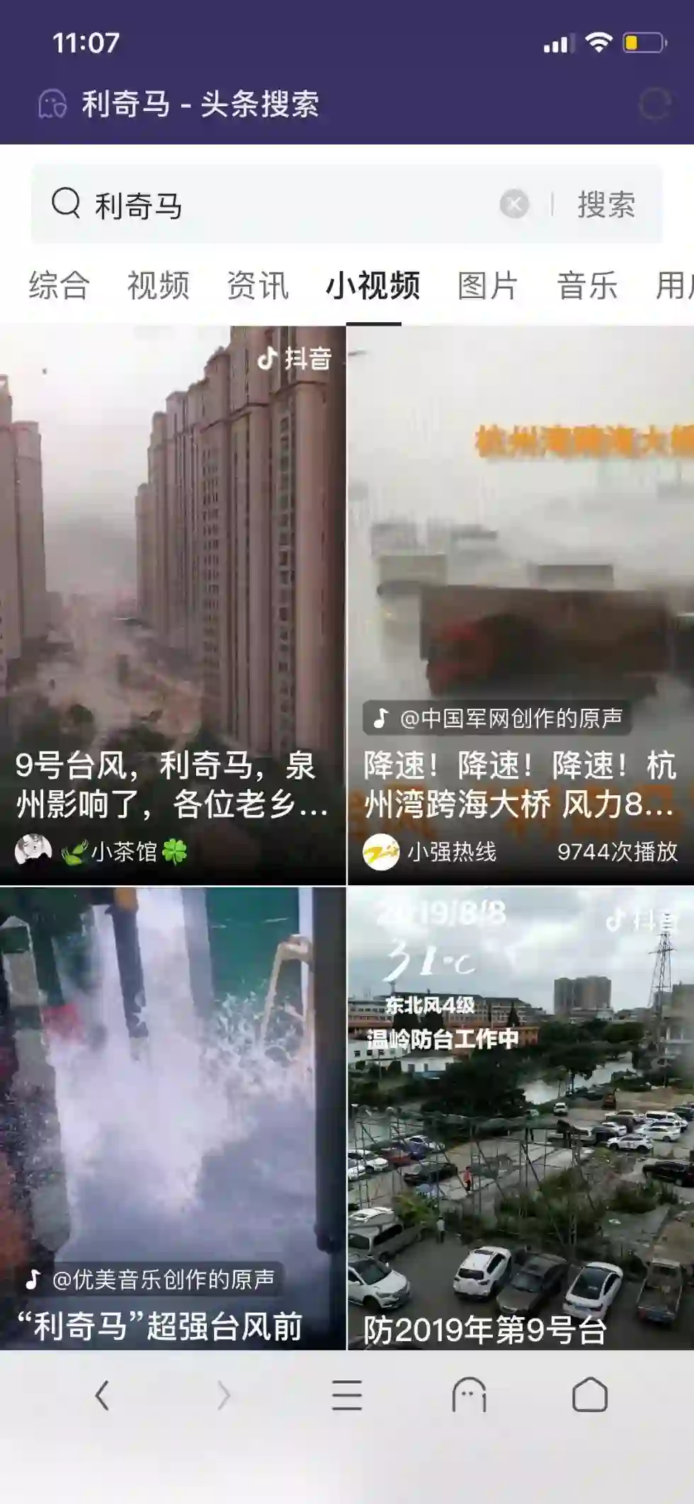 头条搜索的搜索类别包括视频、资讯、小视频、图片、音乐、用户和微头条,《IT时报》记者输入“利奇马”,最新的消息发布于1小时前,搜出的内容基本上是来自各平台头条号上的内容,点击之后,就会链接至该消息的头条号。从搜索出的内容而言,和百度较为相似。字节跳动的标杆产品抖音也在头条搜索中“小视频”类别中发挥了作用,有关“利奇马”的各类小视频从另一个角度展示了这次台风的“威力”,这些来自草根的小视频没有“视频”类别中的视频那么严肃,比如《一分钟彻底搞懂台风是怎么来的》《小姐姐,需要帮助吗#利奇马》等,这一点倒是百度所没有的。