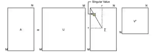 其中U是一个m×m的矩阵,Σ是一个m×n的矩阵,除了主对角线上的元素以外全为0,主对角线上的每个元素都称为奇异值,V是一个n×n的矩阵。U和V都是酉矩阵,即满足U^TU=I,V^TV=I。下图可以很形象的看出上面SVD的定义: