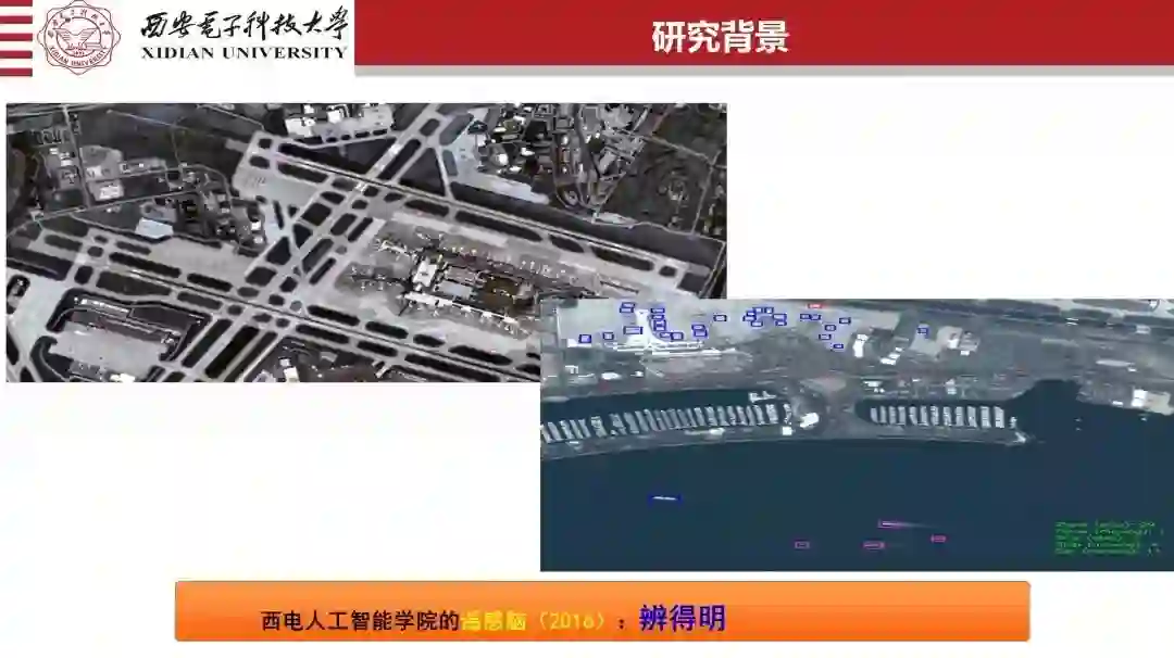 大家可能看不见,这是星载的,就是照相机和雷达装在卫星上然后拍摄地面的视频,船在动、高速上面的车在动、然后机场的飞机在起飞,这是卫星的视频。卫星视频数据量非常大也非常高维,我们同时做到了在卫星视频数据量级上的舰船、飞机、车辆的监测、跟踪和分类,就是你传送多少、运动速度多少、未知的信息全部能够同时的实时识别出来。