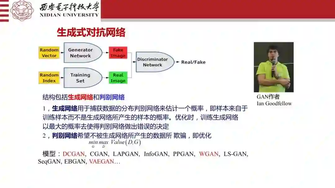 生成对抗网大家觉得是突破,相对传统的网络来讲。多了一个判别器。所以这个是不一样,而且是跟概率结合起来,大家觉得一人搞了一种。我这么告诉你,有了卷积网,有了对抗网,你还要有新模型,千万不要觉得谁好用,谁不好用,这就是深度网络的全部。那是你本事不高,你有本事弄一个深度神经网络模型出来,联想记忆,学习,优化还要到后面的推理,你把这些功能实现了,就像人一样,你的功能就强大了。但是现在,为什么大家关注核心,是把感知和决策结合起来,通过概率,态势,估计和学习是有用的。这应该是非常有用的。
