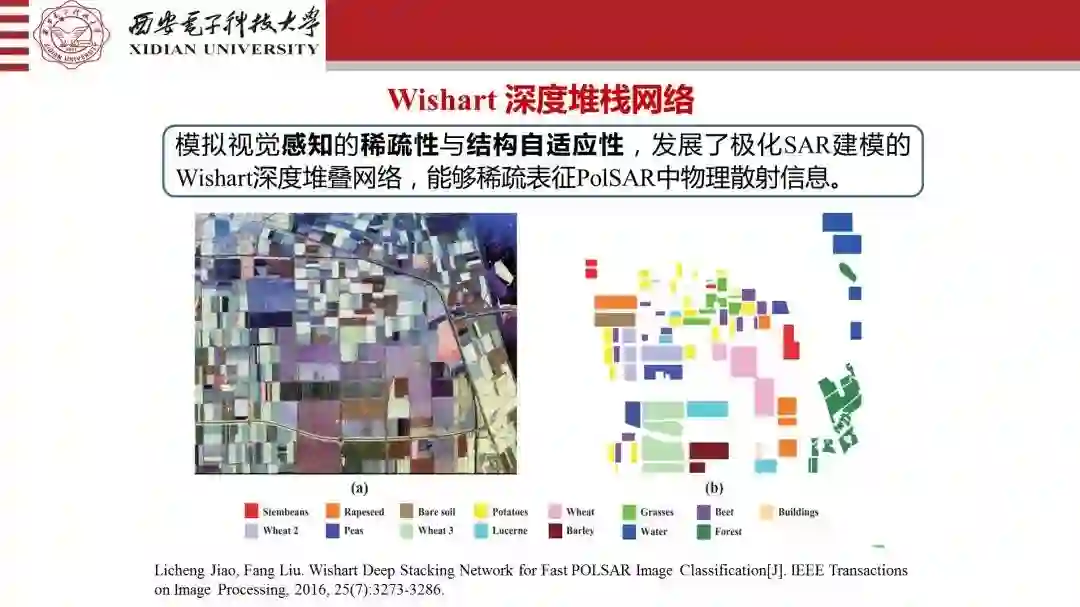 Wishart深度堆栈网络是我们提出来的,将这种物理特性是和神经网络结合起来,实现的结构网络,我们找到了 Wishart深度堆栈网络。我们做的任务是极化SAR图像分类。同样我们做了Wishart的DBN网络,做到了物理获取的机理,视觉的机理和脑处理的机理和结构的结合,构造了相应的深度神经网络。深度神经网络一定是将物理的、生物的、数学的原理结合起来。当然你要更有效,还要在平台上去实现这件事情。