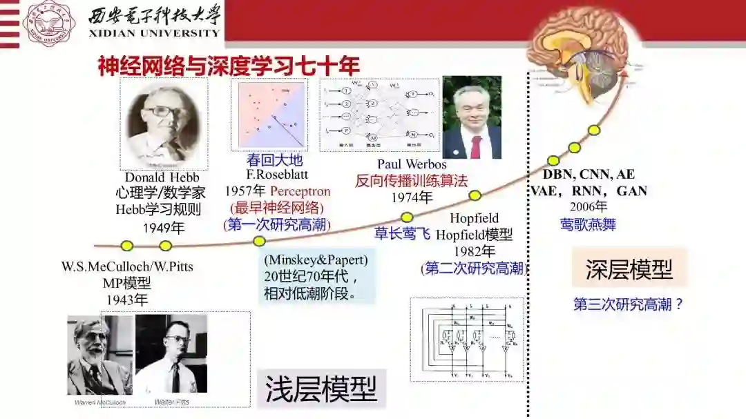 关于神经网络和专家系统,专家系统三个要点要记住:知识的表示,知识的学习,知识的推理。早期推理知识的办法不多、表征的框架不多、手段不多。神经网络给了大家思想和方法,我希望大家记住对神经网络真正有贡献的是这些人,43年Hebb规则和MP模型。1962年Widrow和他的学生提出了LMS。第一台PC机是他发明的,其算法奠定了自适应信号处理和自适应控制技术基础。这个是俄罗斯籍的斯坦福的教授,这个人记住,其貌不扬,我觉得大家都应该记住他Werbos,BP算法是他提出来的,1974年在哈佛大学拿博士学位的时候,就发表了一篇论文就没有论文了,但是博士学位是拿到了,真正的BP算法是他提出来的,使三层神经网络可学习。整个大概十几年的时间很红火,而且是自己也做过世界神经网络学会的主席和先驱,加州工学院Hopfield,三篇文章奠定了他的基础。另外一个记住一个C.Mead,美国的三院院士,世界第一块神经网络的芯片是他做的,这个人在集成电路一直是明星,大家一定要记住这件事情,神经网络不仅是今天。这个是芬兰皇家科学院的院长T.Kohonen教授,他来过很多回,提出了自组织特征映射网。径向基神经网络出自Billing手,因为他是用基函数来做这件事情,做控制的人全部是用的,很高效。支撑向量机,这些都是神经网络模型,而且都是学习机,大家不要认为是完全跟神经网络没有关系,只是说那一阵跟神经网络“划清界限”。浅层到深层的学习,大家要明白,本质性上改变的是什么?你说前面的网络浅,那在哪里深呢?规模深、特征深、还是机理深?还是怎么做的呢?我说理解深度的时候,我们要去做深在什么地方,对数据的匹配在哪些上面是做了本质性的突破和改变,这件事情上我们一定要去做的。