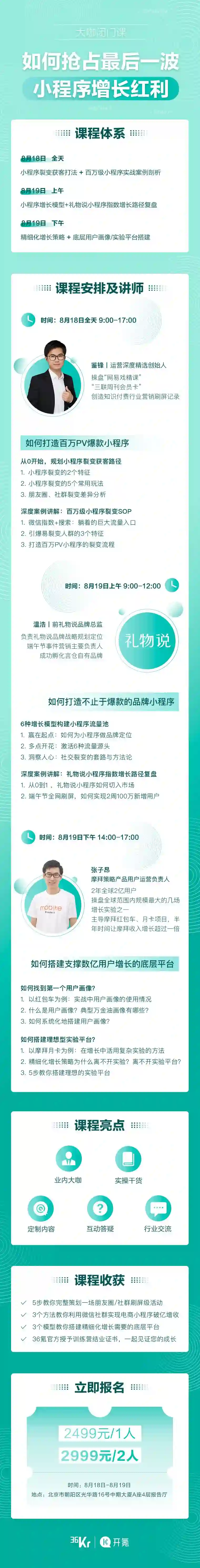 36氪开氪将邀请运营深度精选创始人兼小程序裂变高手鉴锋、礼物说小程序裂变操盘手——前礼物说品牌总监温浩、摩拜单车策略产品团队及全国用户运营负责人张子昂共同打造历时2天的深度闭门课《如何抢占最后一波小程序增长红利》