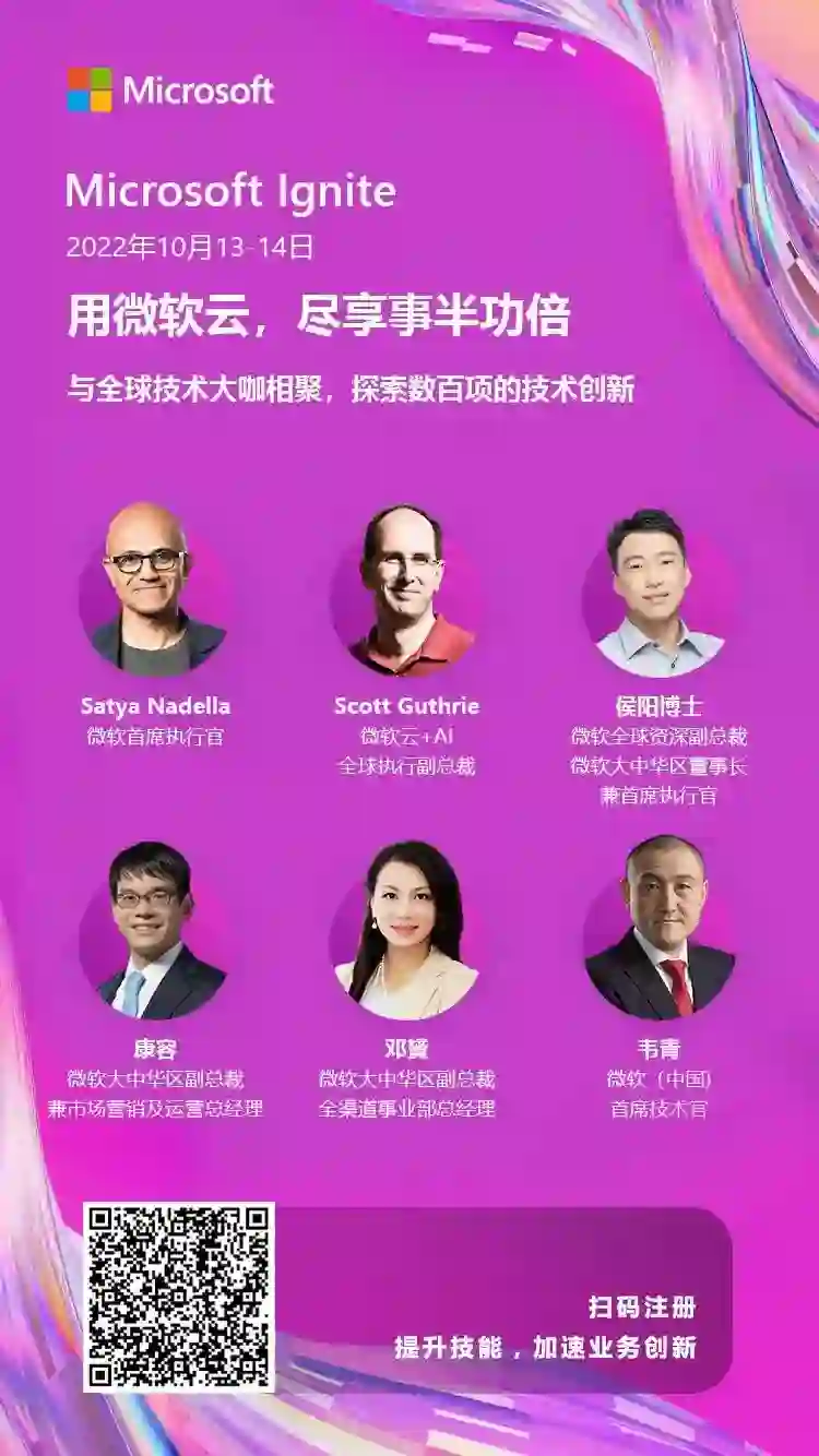 10 月 13 日 -14 日,一年一度面向 IT 决策者、IT 专业人员、企业开发人员的顶级技术大会 Microsoft Ignite 来了!在这里,你将进一步了解微软安全的全局解决方案,获取真知灼见!扫码报名,与万千技术人一起,开启这场为时 2 天的云上之旅!
