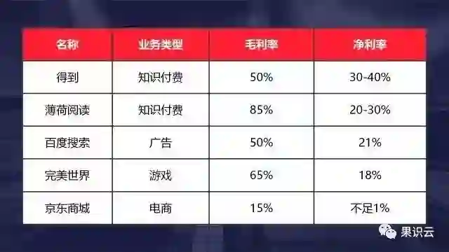 其次,知识付费这个物种,让人想象不到的是,其实比广告、搜索、电商,甚至游戏行业的毛利率净利率都高(如图)。