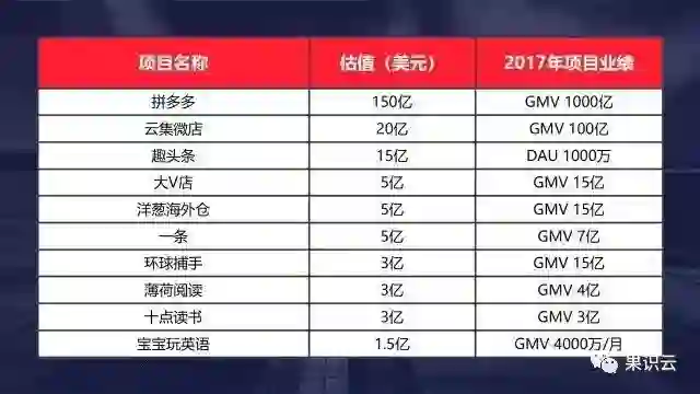 拼多多是完全基于微信生态产生的独角兽,估值150亿,GMV1000亿。近5年来估值top10的玩家里有3个都是跟学习相关的。宝宝玩英语这样一个物种,在2017年最好的月GMV就有4000万。
