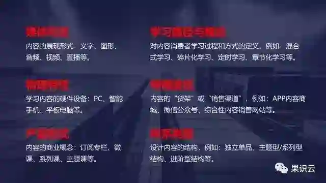 所谓载体即承载知识内容的不同维度属性,比如媒体形态(图文、音频、视频和直播等),产品形式(订阅专栏、微课、系列课、主题课等)、体系类型(独立单品、主题系列型、进阶型等)、传播途径(APP内容商城、微信公众号、综合性平台等)。