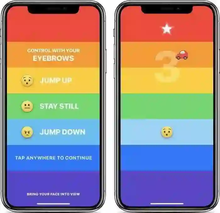 True Depth 相机系统配合 A11 仿生芯片的强大运算能力,面部信息会被捕捉并迅速建模,并实时绘制出 50 多种面部肌肉的运动。因为这一特性,上文提到的 Rainrow 才得以实现效果,毕竟眉毛简单的上挑和下弯都是比较简单的面部肌肉动作(前提是你允许在游戏时打开前置摄像头)。