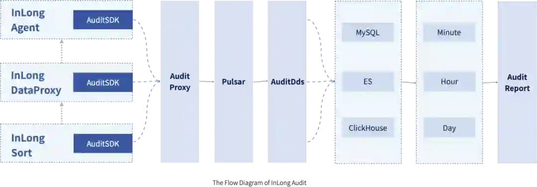InLong Audit 是独立于 InLong 的配套服务,主要用于对 InLong 全链路的 Agent、DataProxy、Sort 模块的入条数、入流量、出条数、出流量等进行实时审计对账,查看数据流是否有丢失或者重复,方便快速定位数据和服务异常。目前 InLong Audit 对账的粒度有分钟、小时、天三种粒度。InLong Audit 的整体架构图,可以参考下方: