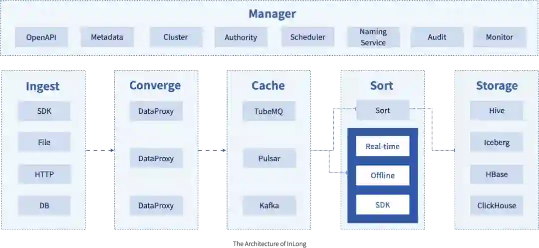 InLong 以腾讯内部使用的 TDBank 为基础,依托万亿级的数据摄取和处理能力,将数据采集、聚合、存储、排序数据处理的全流程整合在一起。不仅提供自动、安全、可靠和高性能的数据传输能力,还支持基于流式的数据分析、建模和应用,帮助企业简化数据处理的过程。
